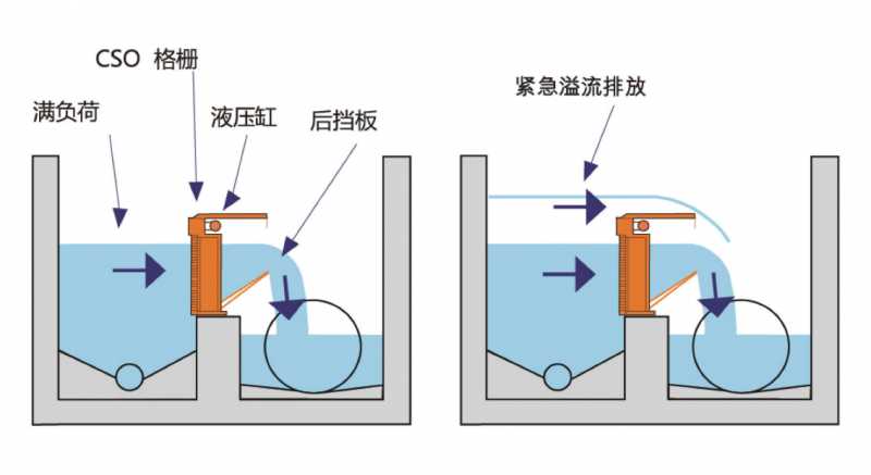 RSW型水平溢流格栅是其中常用的一中简单而有力的合流制管网溢流格栅。它安装在溢流口的混凝土堰上,水流水平横向通过格栅,主要功能是用来阻止漂浮、悬浮、不可生物降解及固态杂质的流出,确保任何大于4mm尺寸的杂质在入流处被筛选掉,从而不会干扰到溢流排放过程,筛渣和固体杂质保留在栅网前端,从而进入后续的污水管。格栅通过电控液压系统控制栅条间隙清洗刷来回运动实现自清洗,当堵塞发生的时候,控制系统通过清洗刷在堵塞位置反复运动直至堵塞清除。格栅背部设置后挡板来保证过栅水流均匀且至大流速不超过1.5m/s。格栅上方为紧急溢流排放口,当格栅自清洗系统失效或者格栅超载的时候,水流可以从格栅上部的紧急溢流口通过。